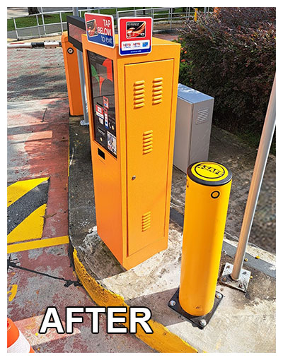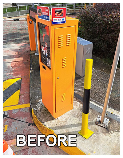 A-Safe polymer bollard in action to protect a carpark access controller module.  The metal pipe bollard has to be replaced and the floor repaired almost every fortnight caused by vehicular impact.  With A-Safe flexible bollard, vehicular impact energy can be absorbed with only 27 degree deflection, protecting the controller module and minimizing damage to the floor and the vehicle.