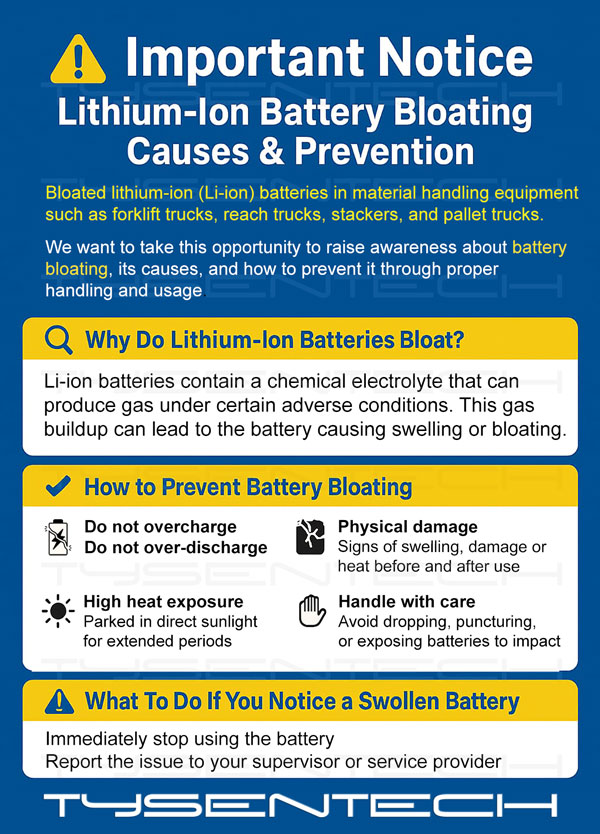 Unlike traditional lead-acid batteries, Li-ion batteries contain a chemical electrolyte that can produce gas under certain adverse conditions. This gas buildup can lead to the battery casing swelling or “bloating.” The most common causes include: