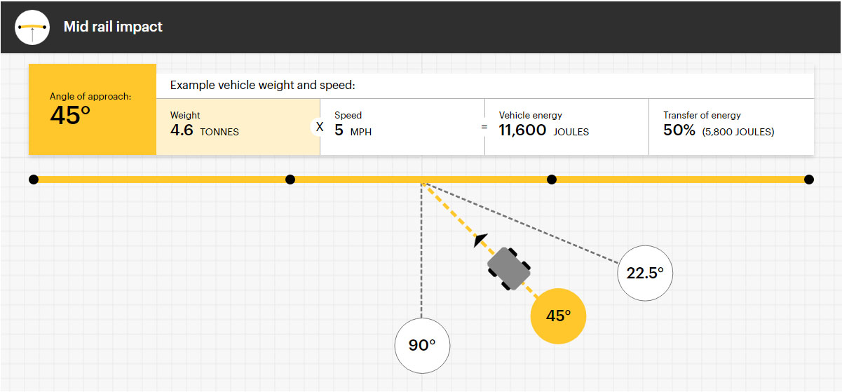 A 1.5m length rail offers up to 11,600 joules of impact energy absorption capacity, equivalent to a laden load of 4.6 Ton travelling at 8 kph and impacting at an angle of 45°